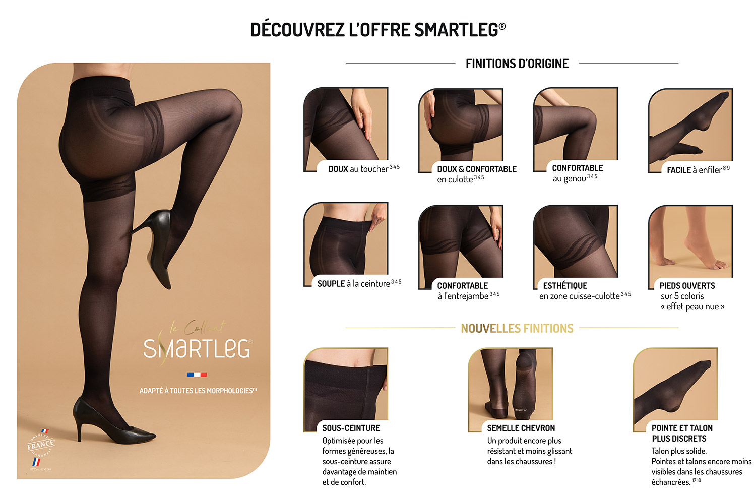 Smartleg® allie l'efficacité de la compression médicale de classe II à un confort incomparable, pour vous offrir une solution de qualité au quotidien. Conçu pour s'adapter à toutes les morphologies ¹, il épouse parfaitement votre silhouette, tout en soulageant vos jambes. Disponible en différents formats (collant, mi-bas, bas) et dans une variété de styles, Smartleg® vous permet de choisir le produit qui correspond à vos goûts et à vos besoins. Élégant, discret et efficace, Smartleg® est le partenaire idéal pour prendre soin de vous chaque jour.